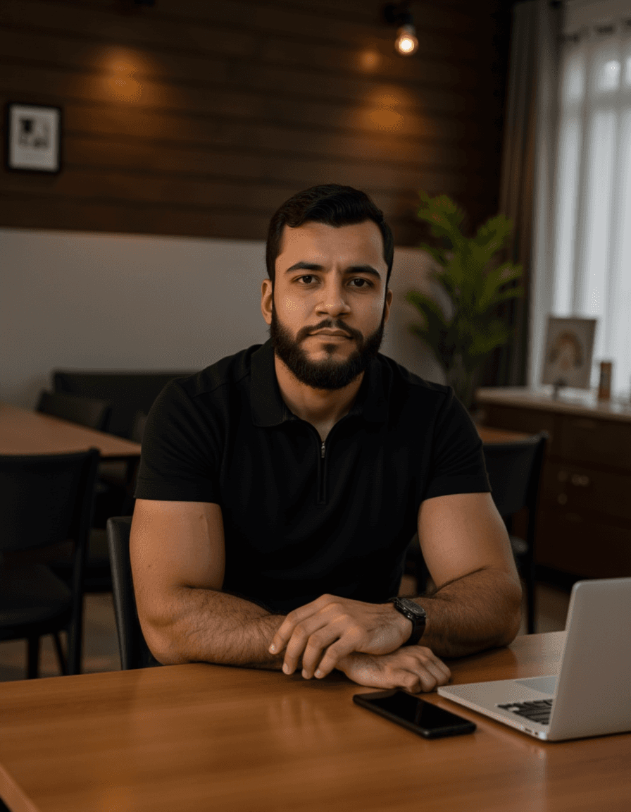 Gero as imagens com IA (Freepik, Krea ou Midjourney) e faço os ajustes finais de direção, tratamento e acabamento.